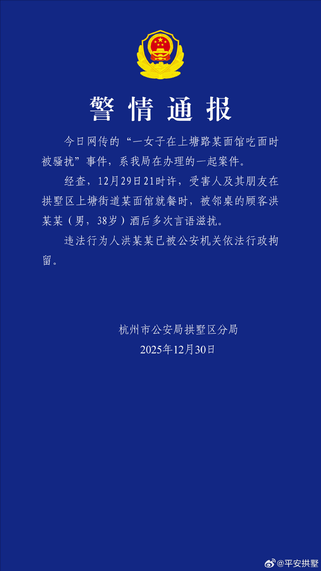 配资短线炒股 杭州警方通报“女子就餐时被言语骚扰”:涉事男子已被行拘